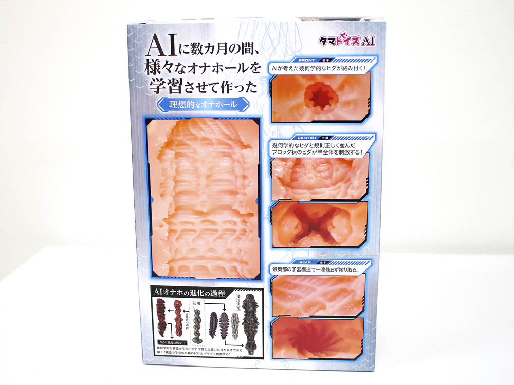 パッケージのイラストがAIが生成したものなのはもちろん、内部構造もAIが作成しているまさに未来を感じるオナホール。内部構造はかなり複雑なヒダとイボとなっている。べたつきが少しあるのでオナシュットなどのパウダーを使うと良いだろう。